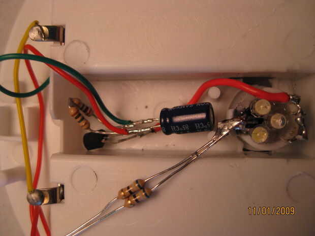 Si todo está bien, necesita encajar perfectamente los componentes en la luz. (imagen 2) Y poner una pequeña cantidad de pegamento caliente en las piernas de mosfet para asegurar que nada obtiene en corto circuito y los componentes quedarse! (imagen 3)
