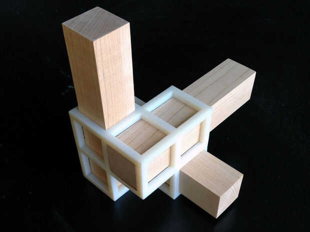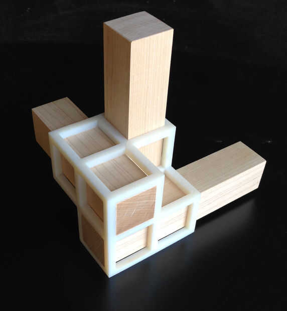 Primero experimentó con la idea de componentes 3D impreso haciendo un empalme de 3 ejes inscrito en un cubo. Cabe 1 "x 1" pedazos de madera. Resultó para ser demasiado torpe para convertirse en un mueble, pero me dio una buena idea para las tolerancias y los ajustes de fricción.
