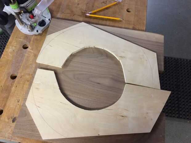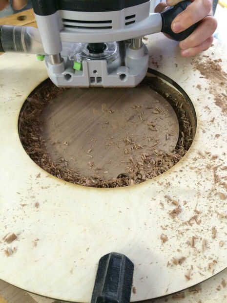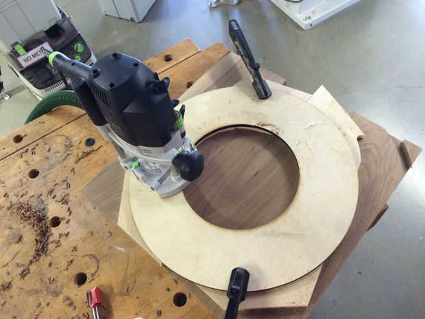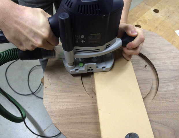 4. usando la plantilla de madera y 2 piezas de aproximadamente corte de capas por debajo, enruta un surco circular 3/8" de profundidad en la parte inferior de la madera. Se trata de la articulación superior.
