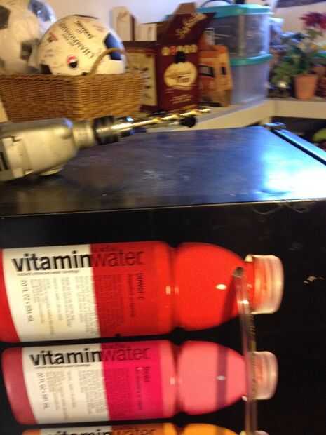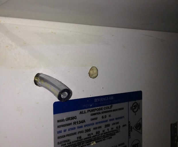 Con una 1/2" broca de taladro en la nevera para insertar su (Desinfectado) 1/4" tubería. Hice dos agujeros para dos grifos en lugar de un agujero más grande así que no tengo que usar algo para llenar el espacio vacío en el orificio de donde saldria el aire frío.