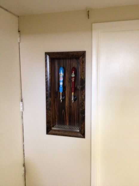 Instalar la caña de cerveza en el "inserto de grifo de cerveza" (lo que nos acaba de hacer) y apriete en su lugar con una llave. Colocar los grifos de cerveza en el la caña de cerveza y apriete con la llave del grifo, sujete las manijas del grifo, asegúrese de que están alineados verticalmente y todo en la parte delantera ahora se ve bonito y acabado. En la parte posterior donde se encuentra todas las cosas importantes.