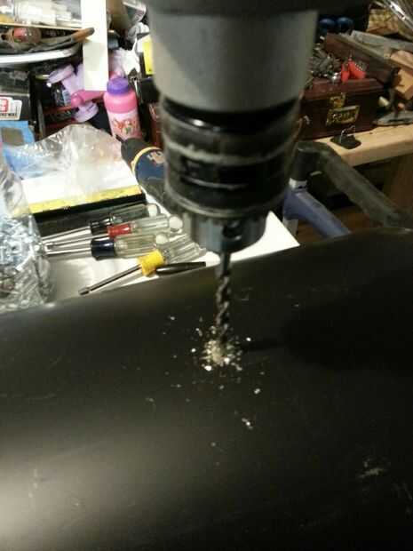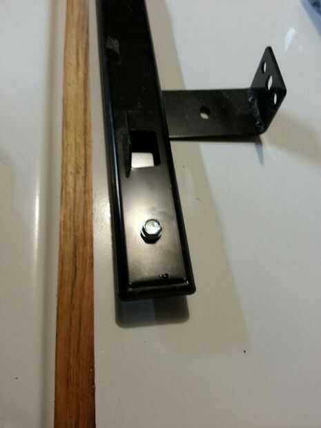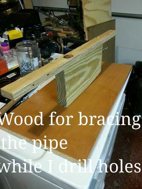 Luego marqué el tubo de la estufa donde iba a perforar. Lo hice colocando el tubo en el soporte y marcar los agujeros con un rotulador. Tenía miedo de que la pipa de la estufa se derrumbaría cuando empecé a perforar, para configurar un bloque de madera debajo de él para apoyar el metal cuando empujó sobre ella. Sujeta el tubo en y los agujeros perforados. Usé algunas tuercas y pernos acero inoxidable con una arandela para mantener en su lugar. Vista trasera de los soportes, de 4", utilizaría a dar el tubo de la estufa más estabilidad. Tener sólo un soporte es un poco tambaleante.