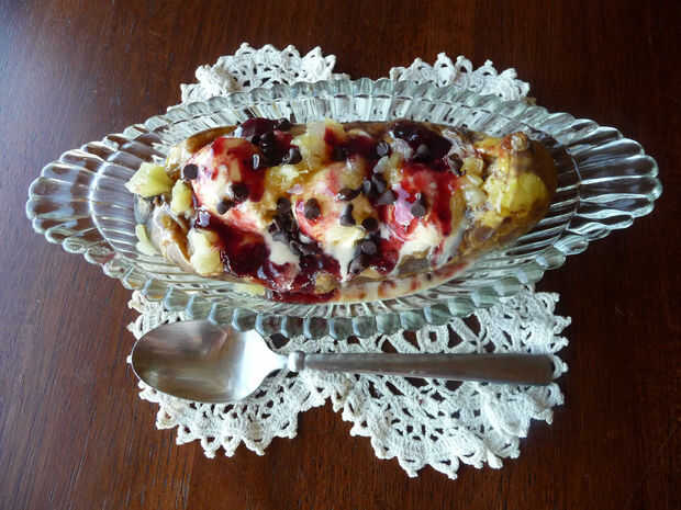 Esta vez microwaved el plátano relleno en vez de asarlo. (a 1 minuto a alta) Resultó perfecto! También he añadido salsa de Chocolate, salsa de caramelo y almendras, fresas frescas y nata batida a la alineación regular a continuación.