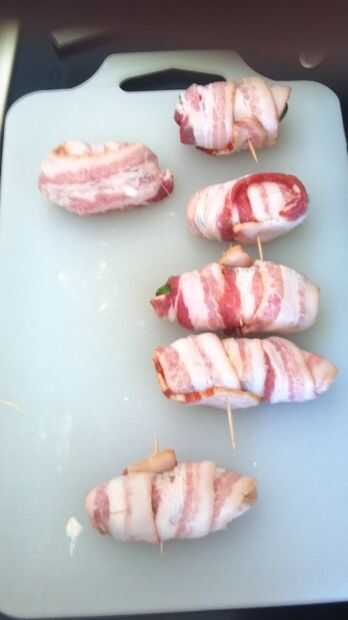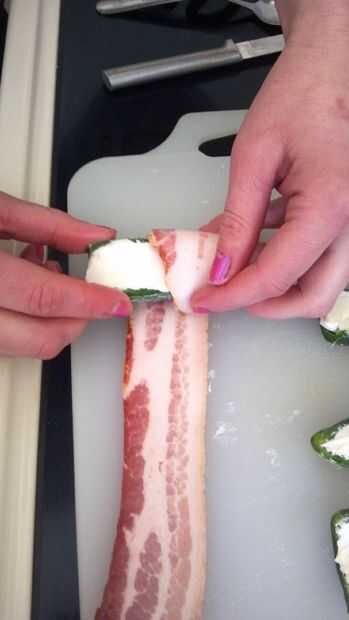 5. Envuelva un trozo de tocino fino corte en el extremo superior de los pimientos y werap vuelta alrededor otra vez en sí mismo, el tocino en lugar de bloqueo.