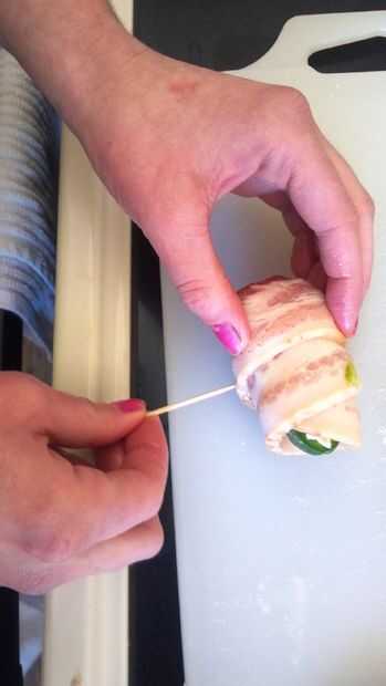 6. Mantenga el embalaje hasta que el pimiento está completamente cubierto de bacon. Utilice un palillo para sujetar el tocino.