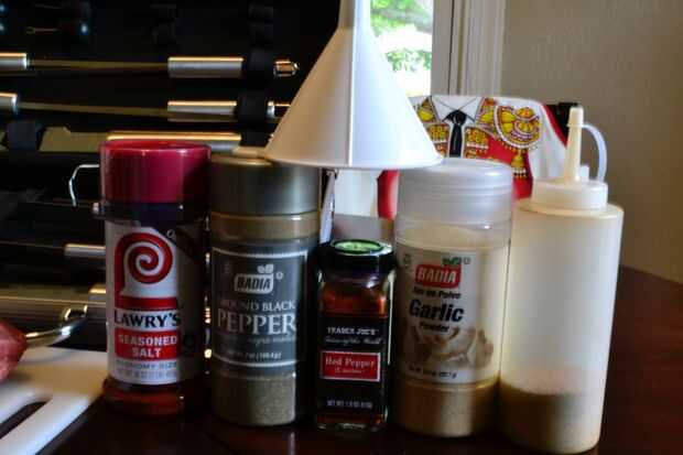 Especias/adobo: Utilizo un condimento casero de mi propia creación que me gusta llamar "Famosa Seamus: todo propósito condimento", porque va con, bueno... todo, porque es un condimento para todo uso. El adobo que utilizo se llama "Salsa de Mmm de Chaka", pero usted puede utilizar su propio adobo de carne favoritos. En general, se necesita: