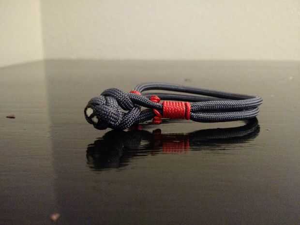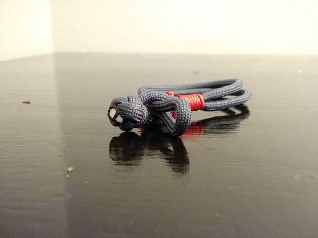 Pase el extremo del grillete a través del pequeño lazo formado por el micro paracord y sobre el nudo de diamante.