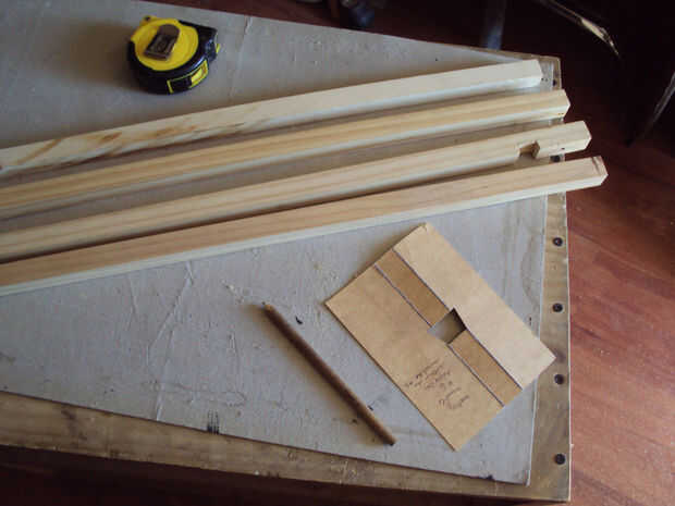 Comenzar a alinear la plantilla en las vigas y donde el corte Irán salidas. Por ahora, sólo necesita cuatro extremos marcados, el do you´ll set complementario más adelante en el paso 11. Ya usé algunas vigas de un anterior proyecto (ver paso 7: quitar los recortes de las vigas), tuve que evitar algunos "defectos" como taladros, corte de abolladuras salidas y surcos, pero en cualquier caso, debe tratar de elegir una longitud de madera libre de nudos grandes por ejemplo.