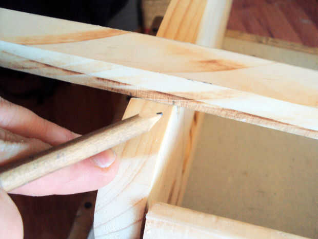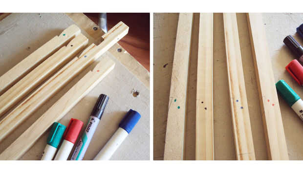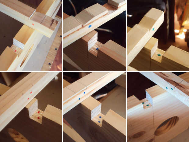 Aunque la cut outs en las vigas y las piernas son muy similares, cada uno es único. Antes de empezar a emparejar para arriba que la viga va donde, les ayuda a código de color para evitar que se les confunde y facilita la futura re Asamblea. Utilicé cuatro colores diferentes, uno para cada rayo y puntos para diferenciar cada empalme (8 en total).