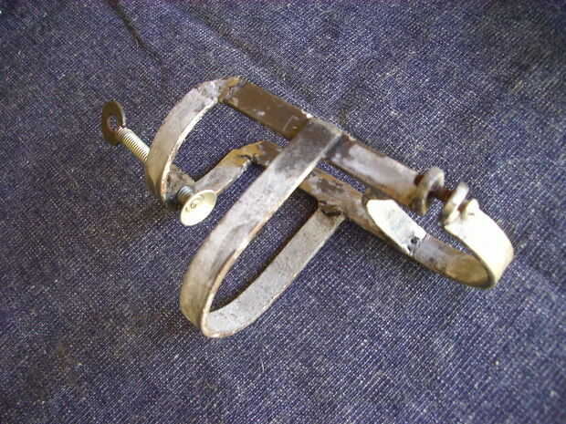Con vara de hierro 1/2" por 1/8" he hecho un soporte que sostiene el cuerpo principal, permitiendo propietarios girando hacia dentro de ciertos límites usar con el izquierdo o derecho (soy zurdo). Esta base se ajusta a la tabla de la manera tradicional, utilizando un tornillo que termina en una arandela cónica.