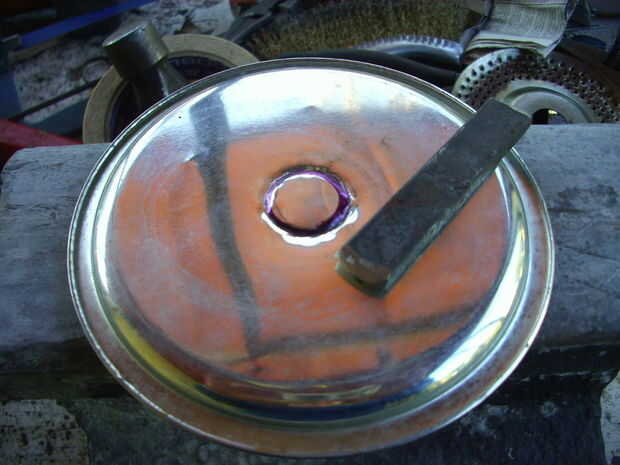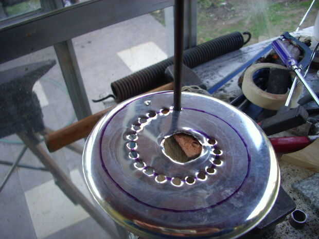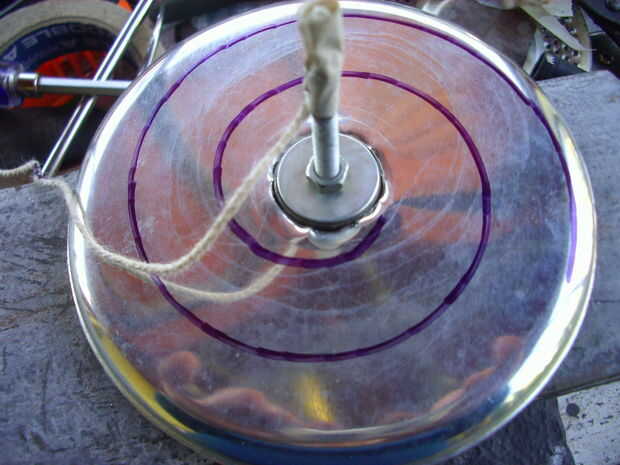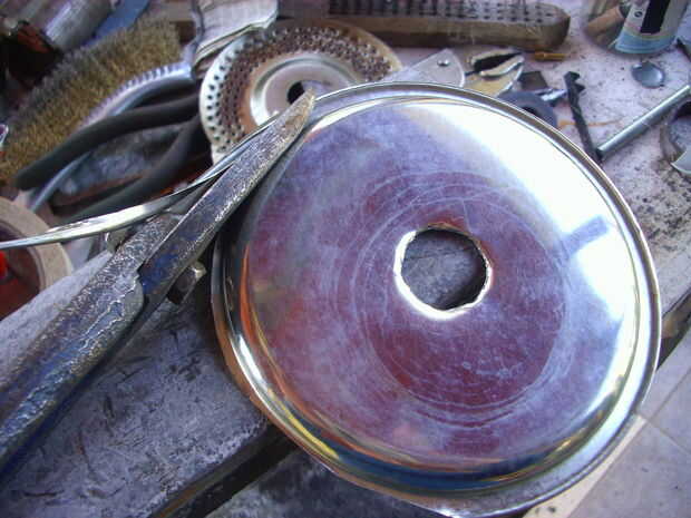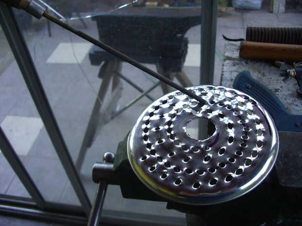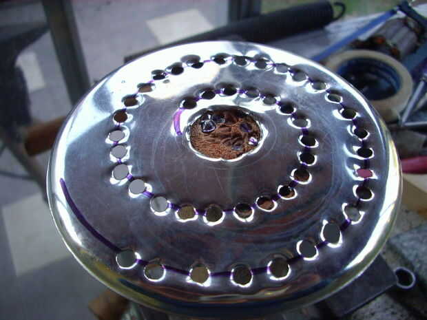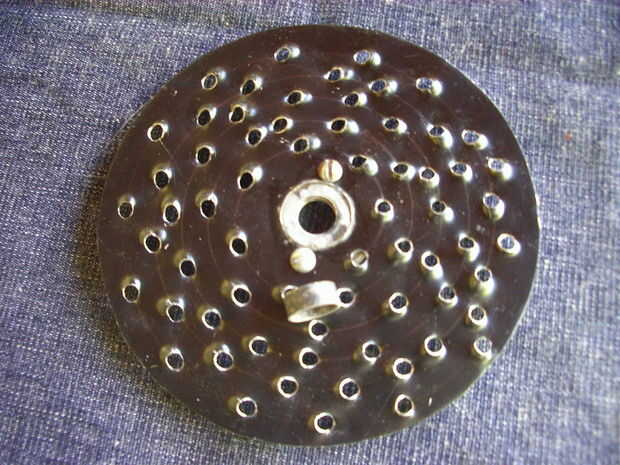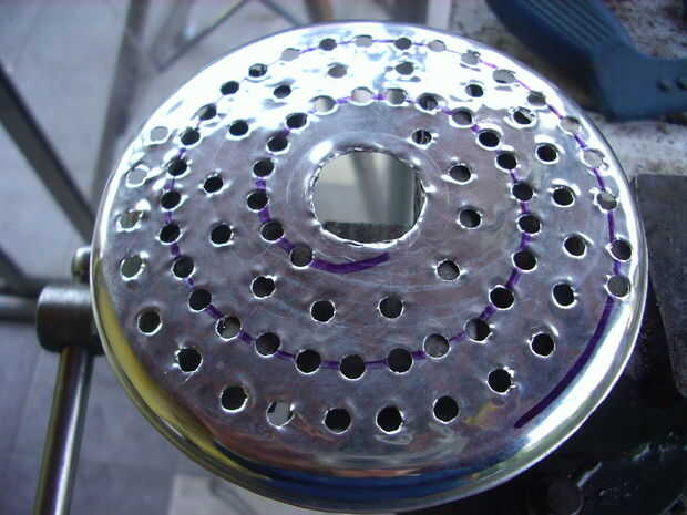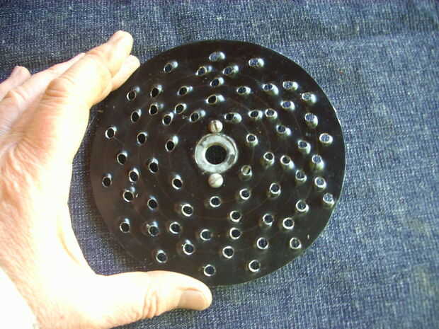 Mi segundo intento fue exitoso, porque usé chapa gruesa. Los agujeros, de 3,5 mm, están distribuidos de manera al girar el disco cubran toda la superficie del queso un rallar.