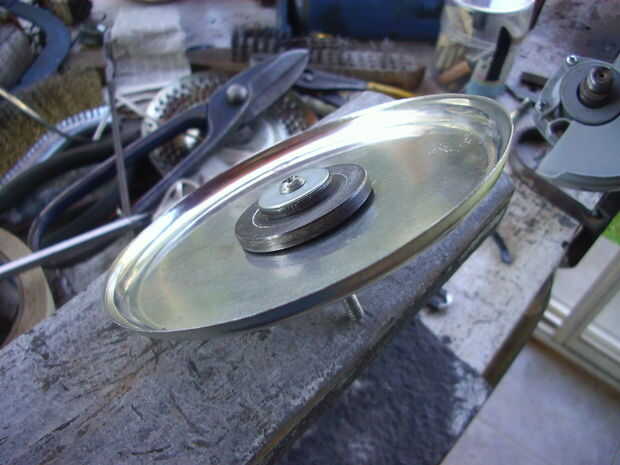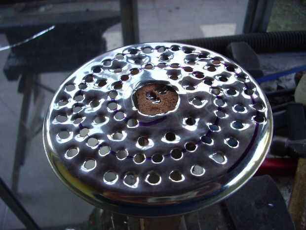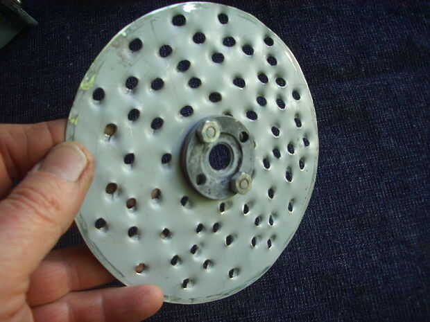 Mi primer intento falló, para aprender algo. Lo hice con un plato que parecía acero inoxidable pero fue encontrado para ser comun hierro con una fina capa de cromo. Estar demasiado delgada, tenía no de fuerza suficiente para rallar queso duro o zanahorias, porque lo torcido. Mi segundo intento fue exitoso, porque usé más pesado de chapa de hierro. Agujeros, de 3,5 mm, están dispuestos de modo que gira el disco que cubren toda la superficie del queso para rallar. El disco está fijado por dos tornillos de la tuerca redonda que normalmente presiona el disco de la amoladora. Desde la arandela de acero redondeada donde los asientos del disco ya no es necesario, he añadido que un pedazo pequeño de tubo de hierro en el orden en el disco de rallado quede al ras con el extremo del eje del tornillo. Esto tiene la ventaja de que con el disco rallador deja una cavidad un poco más alta y por lo tanto más capacidad. Mi esposa y yo nos gusta queso rallado grueso, pero si puedo hacer otro disco con agujeros más pequeños, o escofina hacerlo tierra.
