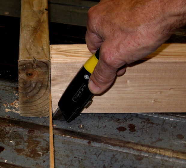 Compruebe cada esquina de la escuadra. Colocar el piso de la bandeja en el paso 10 se corregirán inclinaciones menores, pero si un leve empuje no cuadrado una esquina, afloje los tornillos e Inserte una cuña verticalmente en el lado externo o interno de la articulación. Una grapa o un poco de pegamento ayudará a mantener el calce en su lugar.