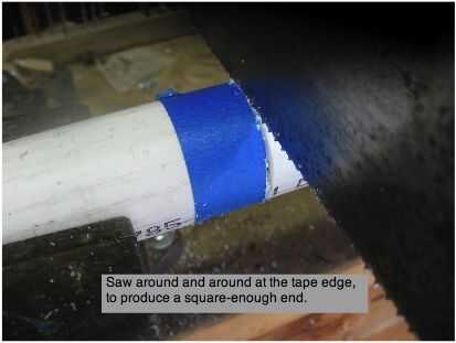 Empezar marcando un extremo para la escuadra (corte si es necesario). Cortar una pieza exactamente 1" de largo y guárdelo para la polea. Si usted tiene una mesa de sierra o una chuleta de la sierra, es fácil. Para cortar un tubo de manera uniforme con un serrucho o backsaw, comience envolviendo cinta azul uniformemente alrededor de la tubería con la cinta situada en la parte medición de la línea de corte (no en la pieza de chatarra). Entonces, en lugar de cortar a través, vio lo suficiente como para iniciar un surco con el borde de la cinta. Gire el tubo y Sierra un poco más y continúe alrededor del tubo hasta que se hace. Por último tomar una escofina o lija gruesa en los extremos de nuevo corte, para eliminar cualquier irregularidad.