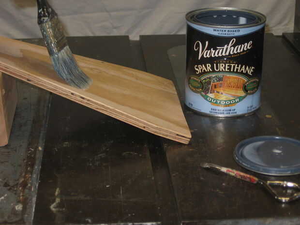 El acabado que utilizo es acabado de un poliuretano exterior a base de agua con un mate o satinado (no brillante). Acondicionador a base de agua es un tal producto; cuesta alrededor de $23 por una lata de cuarto de galón (suficiente para cubrir tres evapotrons). Es fácil de aplicar y no requiere una mano calificada. Usted puede cubrir todas las partes de una pieza de una sola vez, descansando la pieza en los puntos o bordes (no un cara) para secar. Se seca rápidamente al tacto. Si haces tu barnizar justo antes del almuerzo, cuando vuelva que las superficies será seco y realizable. Poliuretano a base de agua tiene muy poco olor, y cepillo de limpieza es fácil. Enjuagar el cepillo bien, varias veces, en agua clara o jabonosa. O, si vas a hacer más barnizar el mismo día, puede poner un unrinsed cepillo y una toalla de papel húmeda en una bolsa de plástico, expulse el aire y refrigerar.
