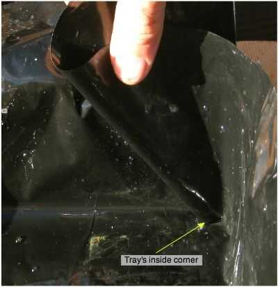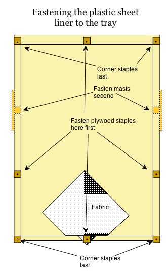 Coloque la hoja en el piso de la bandeja, con pesos (cuatro alimentos de latas, por ejemplo) manteniendo apretado en las esquinas. Ajustar la posición para que la hoja encuentra contra el piso, el borde interior de caras y el borde de la tapas. No te preocupes todavía la hoja de agrupar para arriba en las esquinas. Si se superpone cualquier proyección los pernos de carruaje, forzar los tornillos para hacer agujeros en ella.