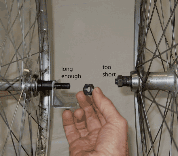 En el lado externo de un extremo del tambor, un eje de rueda de holllow debe extenderse por lo menos 1/4 de pulgada. [[Instrucción anticuada.]] Puede que necesite quitar las arandelas o espaciadores, o "cambiar" el eje aflojando tuercas cono y girando el eje sujetando los conos todavía. Estos árboles exteriores no necesitan tuercas; permanecen enjaulados por escuadras.