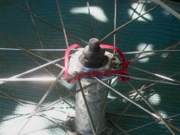 Las ruedas delanteras se utilizan sólo como extremos del tambor. En algunas ruedas delanteras, el eje tambor se patina alrededor de los radios y no permanece centrado. En estas ruedas, construir una jaula como una flor de tres pétalos de alambre de hierro o alambre de cobre de 14 o 16 ga. Escoge tres rayos, más o menos uniformemente, cerca del centro. Envuelva el alambre una vez alrededor de uno habló y guía para el próximo rayo, dejando aproximadamente una pulgada de "holgura", luego repetir en el tercer rayo y alrededor a la primera otra vez. La curva según sea necesario para hacer una jaula aproximadamente triangular que se adapta el tubo de PVC.