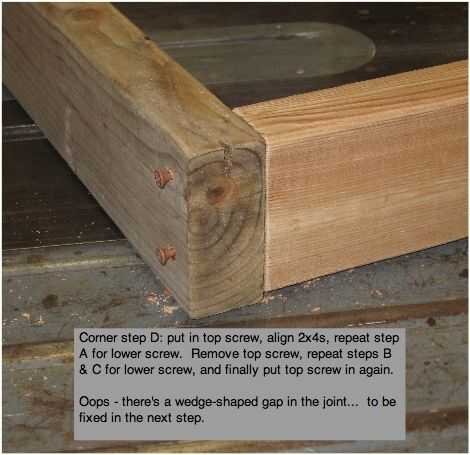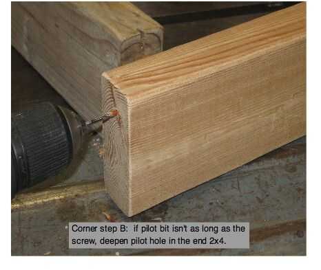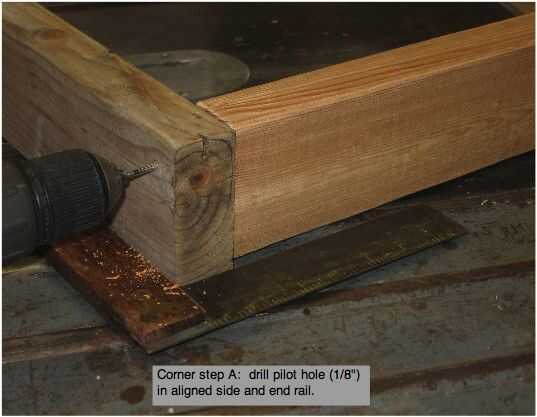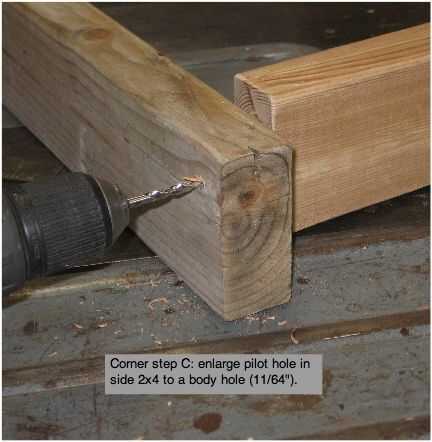 En cada esquina, taladre agujeros piloto y cuerpo y enrosque dos tornillos de 3", pero no apriete completamente hasta el final del paso 9.