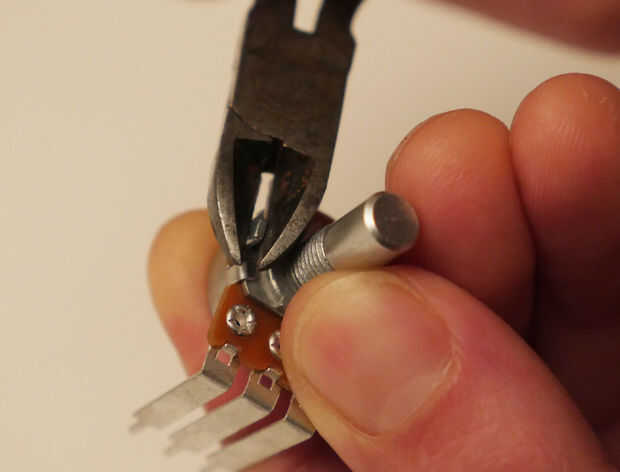 Romper las lengüetas de fijación en los potenciómetros con unas tenazas o alicates. El metal es suave y debe dar fácilmente y romperse limpiamente. Sostenga el cuerpo del potenciómetro con una mano (como se muestra) que sujeta el potenciómetro por sus pasadores.