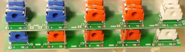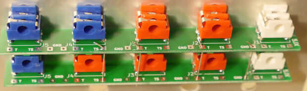 Coge 4 de los puentes que apartar en el paso 4. Comience con el buss de tierra entre la entrada y salida toma (GND). Insertar el puente a través de ambos orificios y el puente de la curva en la parte superior para mantener en su lugar. Soldar primero el puente de tablero inferior (entrada) jack. Ahora el botón GND en el tablero superior de jack (salida) de la soldadura. A continuación, utilizando la misma técnica, conecte los electrodos de punta (con la etiqueta T) entre los consejos de gato para las tomas de parcialidad y sesgo de mezcla. Después de eso, tome el puente 3 y conecte los electrodos de la T de los enchufes Freq y Freq Mix juntos. Por último, soldar el último puente entre la salida de onda de triángulo y el Mod de entrada a través de las almohadillas de punta interruptor (etiquetados TS). Las fotos ilustran claramente cada una de estas conexiones.