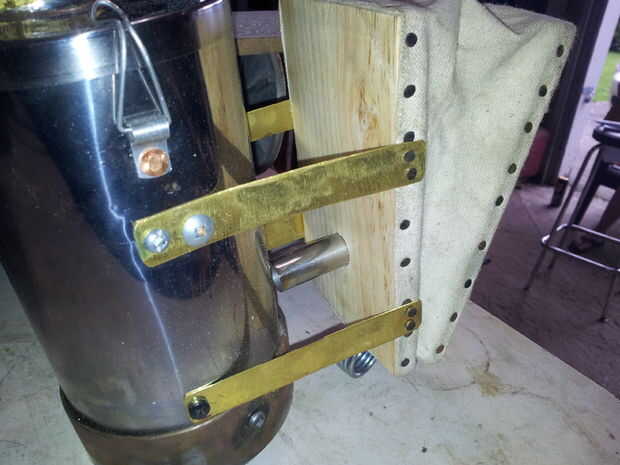 Como se puede ver en las imágenes, la salida del fuelle no está conectada directamente a la lata, y de hecho se deja un espacio de 1/4" entre. Esto es para evitar que la ceniza y chispas de ser aspirado en el fuelle y haciendo que se inflame.
