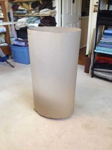 Corté un pedazo grande de papel que era 3 pies por 8 pies y la base del tubo para la cabeza unos 5 pies alrededor. Dentro del tubo base son 3 anillos (también a unos 5 pies alrededor) que se cortan de cartón resistente que fueron utilizados como las costillas para mantener el tamaño y forma del tubo. Los anillos fueron conducto pegada al base tubo de papel. Los anillos se colocan cerca de un tercio del camino desde la parte superior e inferior y en el centro. El tubo está formado con 2 capas de papel envuelto alrededor de los anillos de la costilla. Pegan estas capas de papel.