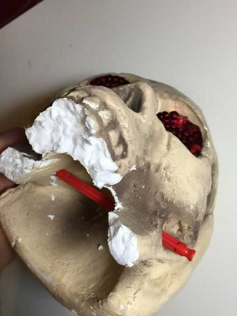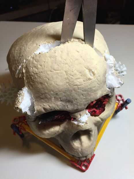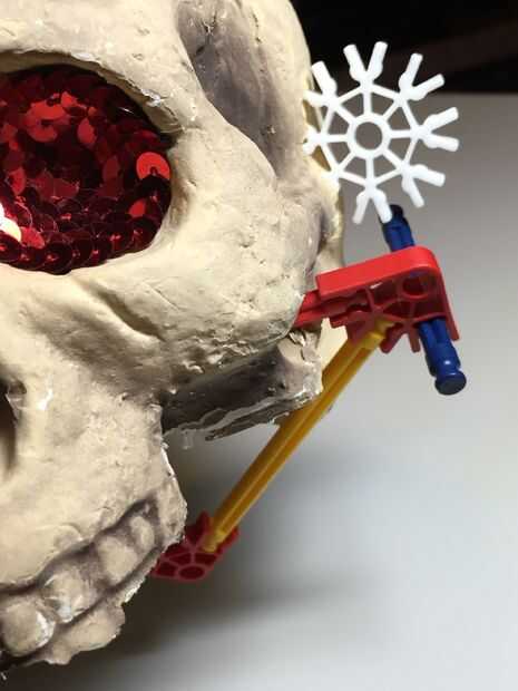 La estructura del cráneo era bastante básica. Utilicé unas tijeras para quitar espuma en exceso y perforé algunos agujeros para instalar una boca K-nex que se mueve.