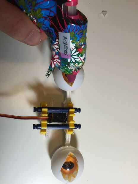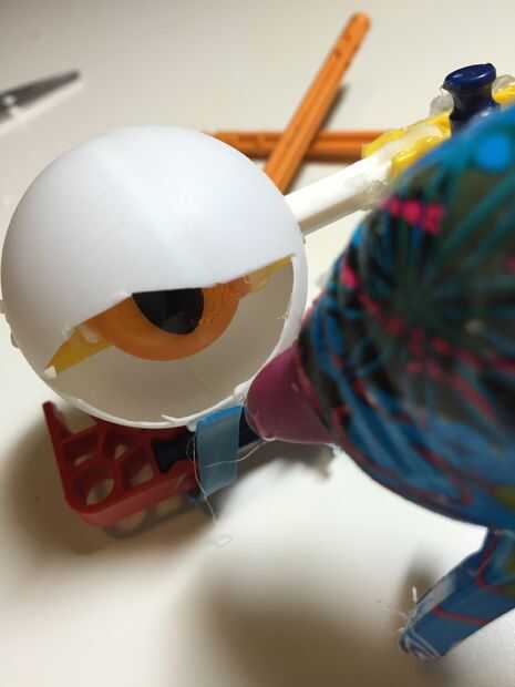 El mecanismo de abrir y cerrar llevó algún esfuerzo para montar. Os adjunto algunas bolas de pingpong con perforado y corte agujeros para algunos K-nex que fue unido al servo. He atado sedal al extremo del servo y caliente lo había pegado a la parte inferior de las bolas de ping-pong. También os adjunto elásticos a los ojos y la estructura de K-nex para que regresen a la posición original cuando el servo no está disparando. Hay algunos grandes tutoriales sobre cómo hacer robóticas ojos parpadear. Aquí hay un enlace a uno: