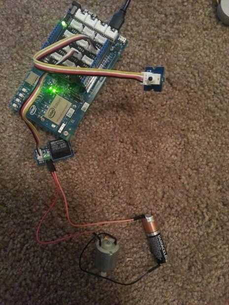 Utilizando Grove cables conectar botón D3 y relé a D6. También conectar positivo del elemento prueba (motor DC) a uno de los agujeros verdes (no importa cuál) en el elemento de relé. Conecte el negativo de prueba elemento negativo de pila y usando cable jumper macho Conecte el positivo de la batería a otro agujero verde o elemento de relé. Circuito puede verse en las imágenes. Conectar el cable micro del USB al puerto más cercano a la fuente de alimentación y conecte el otro extremo al ordenador. Utilizando el Software de Arduino, copiar pegar el código siguiente en una ventana y subir. Motor de C.C. funciona cuando se presiona el botón.