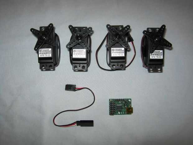 - Cuatro servos pequeño hobby barato como el TS-53 de Tower Hobbies.
