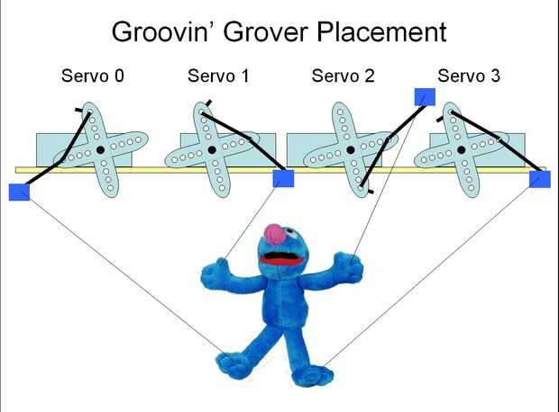 Mecánicamente, Grovin' Grover se basa en una marioneta de dedo de Grover a cuatro servos hobby barato. Los servos están conectados a cada uno de sus miembros lo que permite movimiento independiente. Construí un simple "etapa" para la celebración de Grover y los servos en el lugar. Usé Velcro para atar el Grover y los servos al escenario para que las partes pudieran mover fácilmente y ajustadas para conseguir Grover en la posición adecuada. Cinta de pintor y clips de papel se utilizan para sujetar los hilos a los cuernos servo: los clips de papel se puede doblar para conseguir el movimiento correcto y cinta de pintor se quita fácilmente si hilos necesitan ser reemplazado.