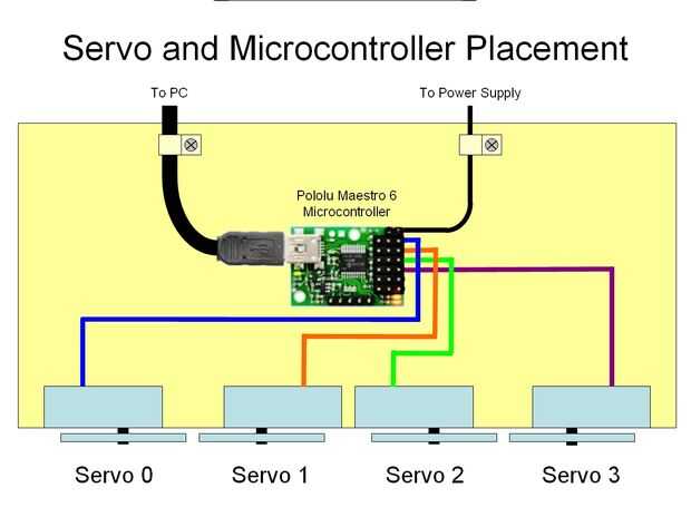 Cada servo se une al microcontrolador utiliza conectores estándar que vienen con los servos. Servo 0 controla el pie izquierdo; servo 1 controla la mano izquierda; servo 2 controla la mano derecha; servo 3 controla el pie derecho. Los servos necesitan estar conectados al microcontrolador, tal como se muestra en el diagrama para Grover Groovin ' a moverse adecuadamente. Más información sobre los diferentes conectores en el microcontrolador puede encontrarse en la Guía del usuario del controlador Servo Pololu Maestro.