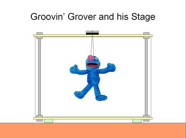 El segundo diagrama muestra Grover Groovin ' y su etapa. Su escenario está hecho de dos plataformas soportadas por varillas roscadas y tuercas hexagonales. Grover es suspendido 4" desde la plataforma superior: un trozo de hilo de nylon transparente es a través de la parte superior de la cabeza y atado a una lavadora. La lavadora se sostiene en la plataforma superior con Velcro. Patas de goma se fijan a la parte inferior del escenario para impedir que las arandelas que la superficie de donde se coloca la etapa y asegurar que la etapa no rock y hacia atrás cuando se mueven los servos. Un pedazo de tela blanca cuelga de la parte trasera del escenario como telón de fondo. El telón de fondo se encuentra en la parte inferior de la plataforma superior con Velcro. El telón de fondo esconde energía y cables USB y permite que el hilo de nylon transparente para confundirse con el fondo que permite Grover Groovin ' parecen flotar.