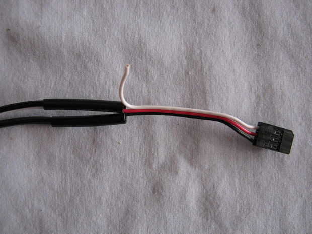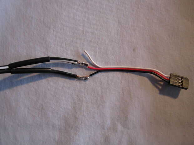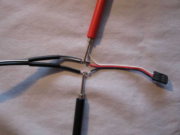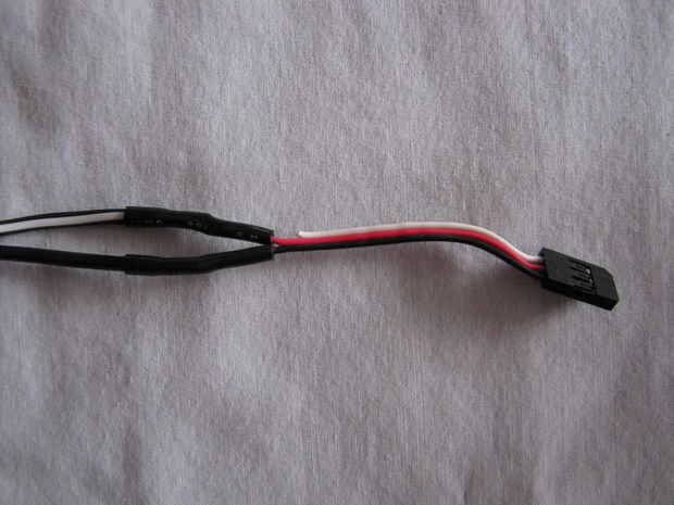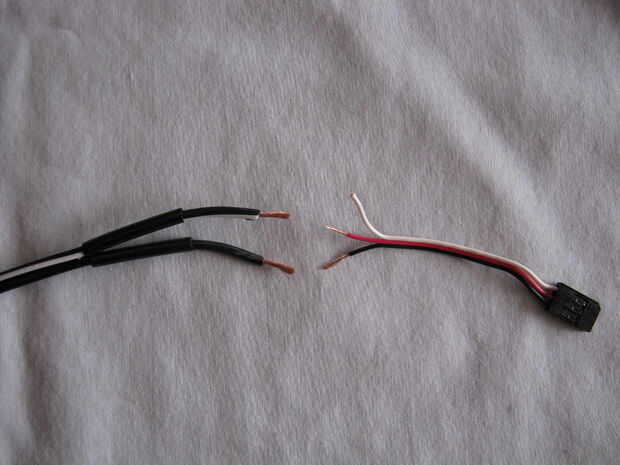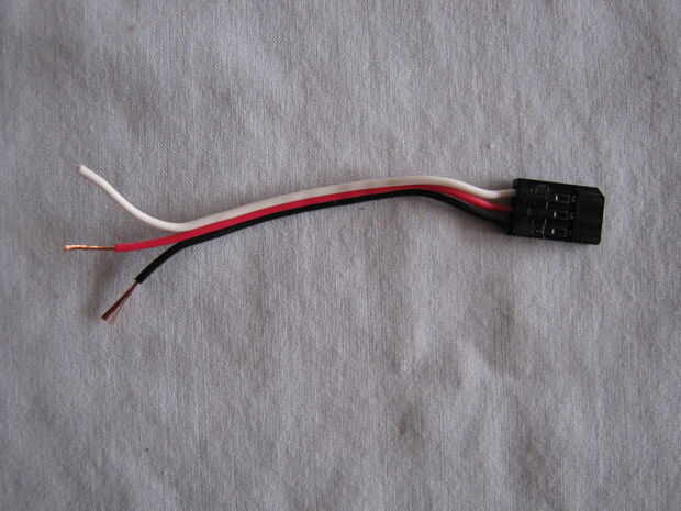 5. Corte el J Futaba conector cable como se muestra en la foto séptima. Mantenga el extremo con el conector que se muestra en esta foto. Tira de los cables rojo y negro como se muestra.