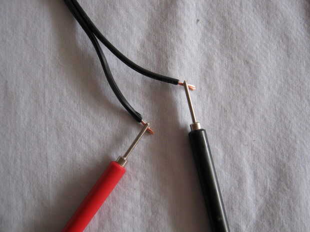3. Asegurándose de que los cables pelados son no tocar, enchufe en la verruga de la pared y utilizar un voltímetro para probar la polaridad de los cables como se muestra en la cuarta foto. Si está usando un voltímetro analógico, la aguja en el medidor debe moverse a 5 voltios, como se muestra en la foto quinta o si está usando un voltímetro digital, la pantalla debe leer + 5 voltios. Si no invertir las puntas de prueba y vuelva a intentarlo. Haga nota de cual cable es positivo y cual es negativo.