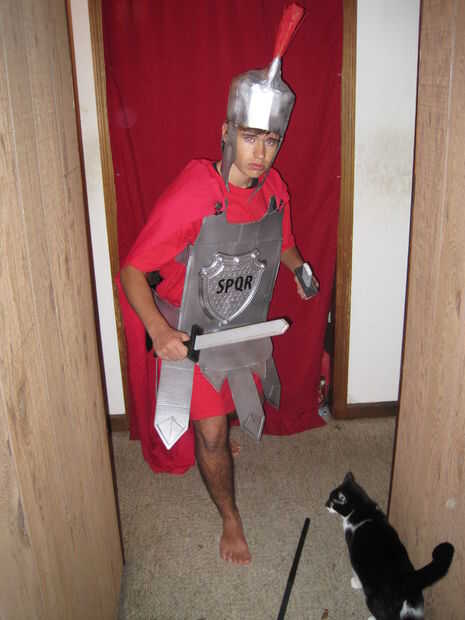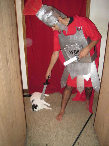 Soldado romano en la Legión cartón haciendo batalla con gatos salvajes--tomado de este instructable, más fotos están disponibles aquí. El otro traje de la incorporación de una escoba en la cabeza. Esto le consiguió un grado 100% en la clase Latina hace unos días.