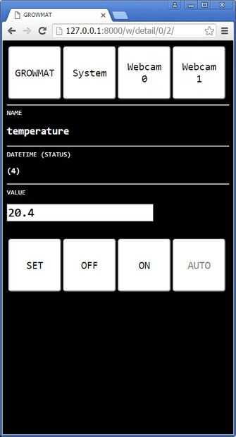Como salida puede iniciar script bash. Por secuencia de comandos puede tomar foto desde una webcam USB, reproducir sonido en altavoz, enviar Jabber o mensaje de correo electrónico o cualquier otra cosa que usted quiere. Se secuencias de comandos de uso previsto también como entradas, por lo tanto usted puede utilizar por ejemplo información de internet (e. g. Previsión del tiempo) en sistema GROWMAT similar como cualquier otro instrumento.