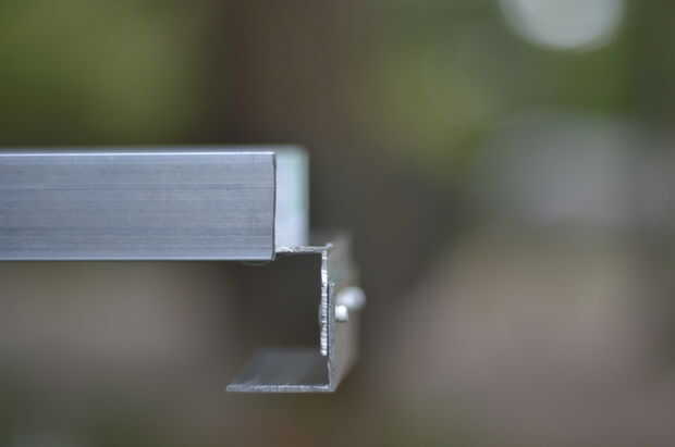 Vista lateral del ángulo de aluminio que forma la cerradura. Remaches del punto hacia fuera así que su no impiden los caminantes de fijación mecánica.
