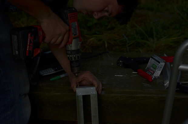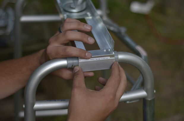 Establecer el marco en el andador con el walker abrió completamente, mantenga ángulo apretado a la pieza ya clavada para que la pieza que está sosteniendo va por debajo de los puños de los caminantes. Marque una línea.