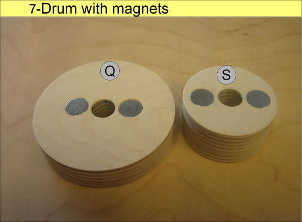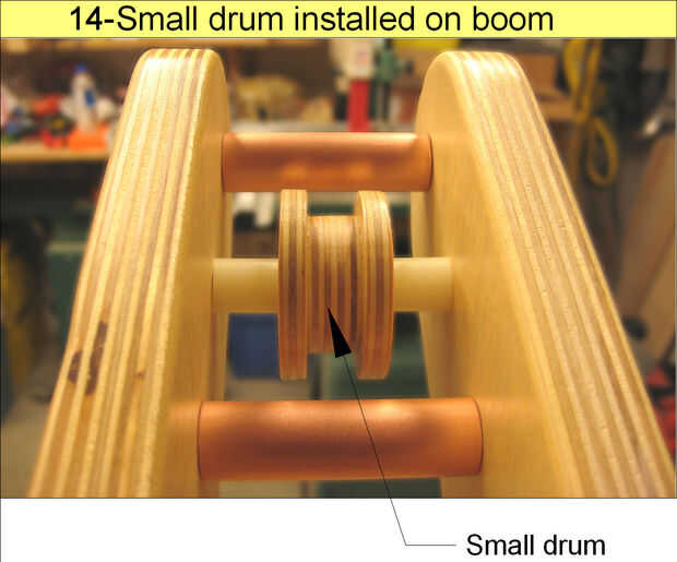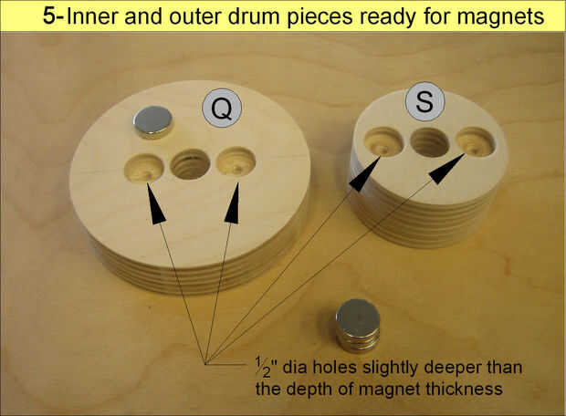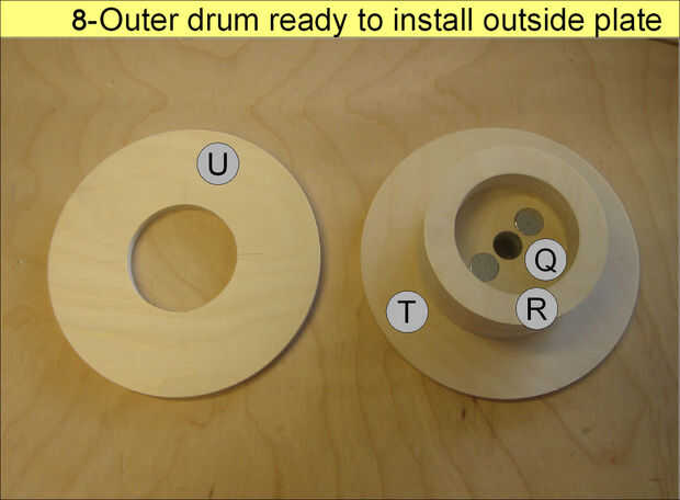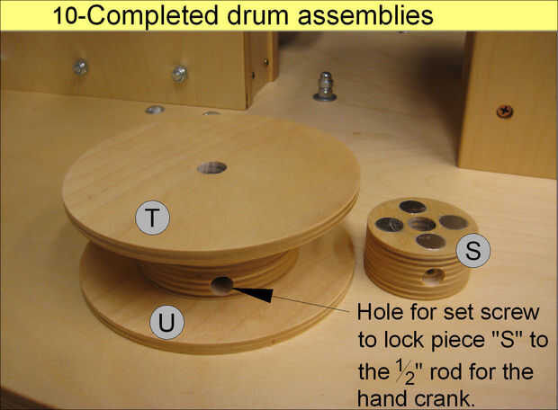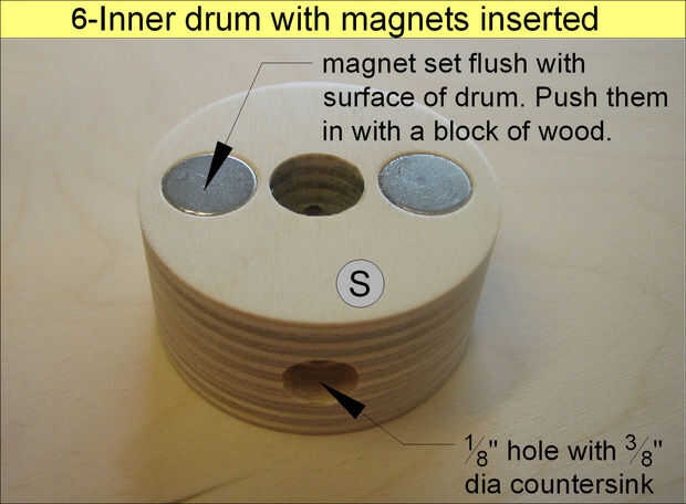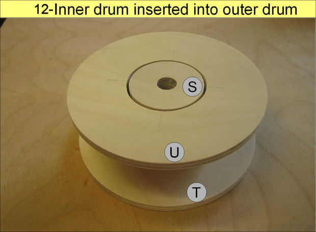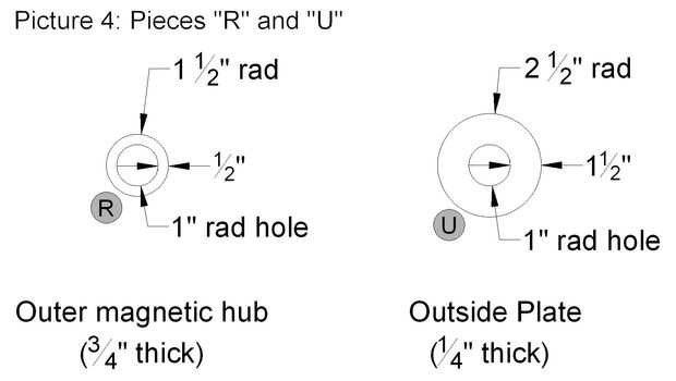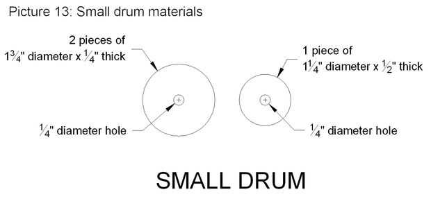 El pequeño tambor o eje está montado de 1/4" de espesor y 1/2" espesor Báltico contrachapado de abedul. Cortar dos círculos de 1/4" de espesor y un diámetro exterior de 1-3/4" con un agujero central de 1/4" de diámetro. Cortar el 1 círculo 1/2" de grosor y un diámetro exterior de 1-1/4" con un agujero central de 1/4" de diámetro. Ver imagen #13.