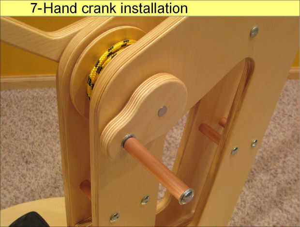 Utilice un tornillo de madera gruesa de 2" de oro para instalar la manivela. Asegúrese de insertar una arandela plana de 1/2" entre la manivela y el auge de la varilla de acero de 1/2". Ver cuadro #7.