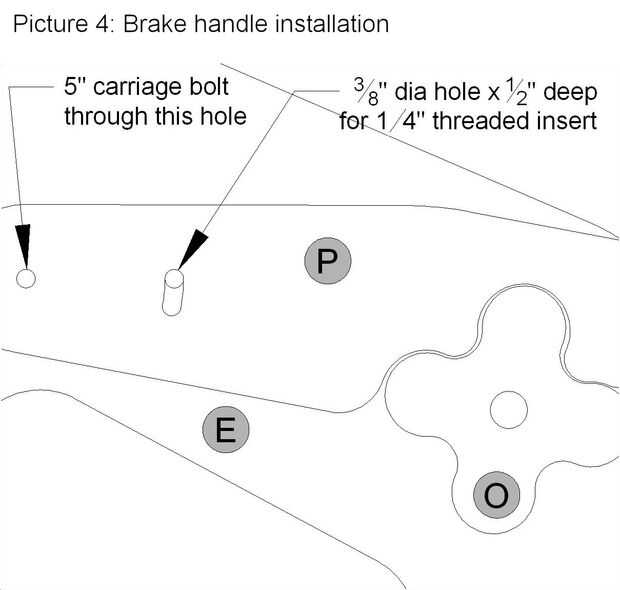 Que el freno de resto "P" en el engranaje del freno "O" como se muestra en el cuadro #4 abajo de la manija. Marca el agujero para el 1/4" Inserte en auge"E"en la parte superior de la ranura en la manija del freno mientras está en esta"posición inferior".