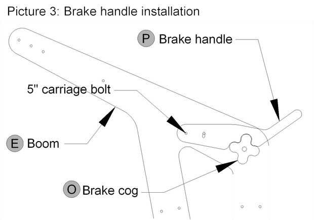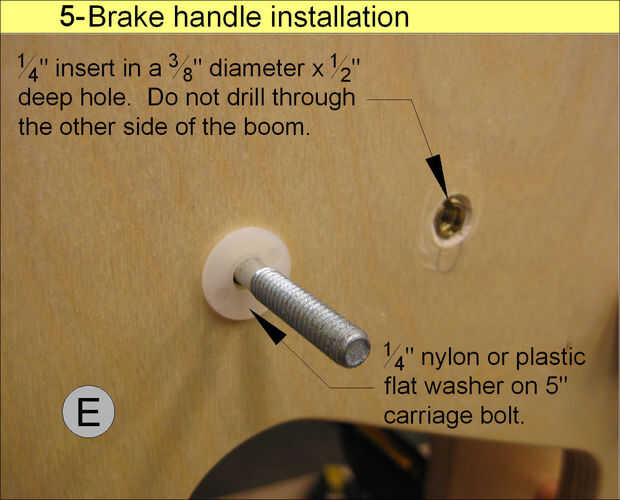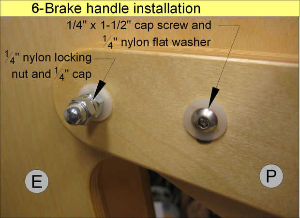 Instale la manija del freno "P" en el final del 5" perno cabeza de carro como se muestra en la imagen #3 abajo. Incluyen un 1/4" diámetro nylon o plástico arandela plana entre la manija de freno y auge. Ver cuadro #5. Añadir otra 1/4 plana arandela de nylon en el exterior de la manija del freno. Termine instalando una 1/4" cierre tuerca de nylon y un casquillo de 1/4" como se muestra en el cuadro #6 abajo.