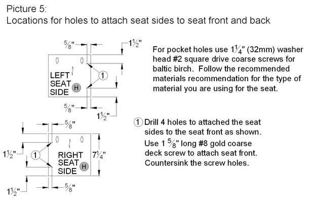 Para agujeros de bolsada use 1-1/4"(32mm) arandela cabeza #2 cuadrados gruesos tornillos de abedul Báltico. Siga las recomendaciones de materiales recomendados para el tipo de material que usas para el asiento.
