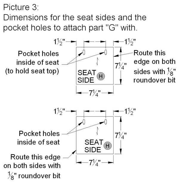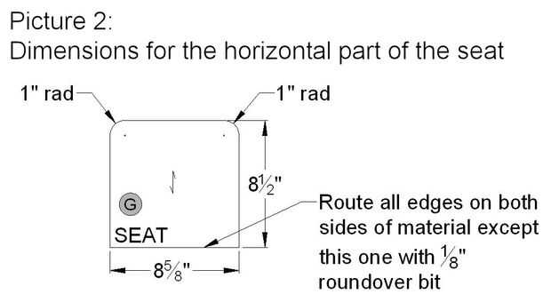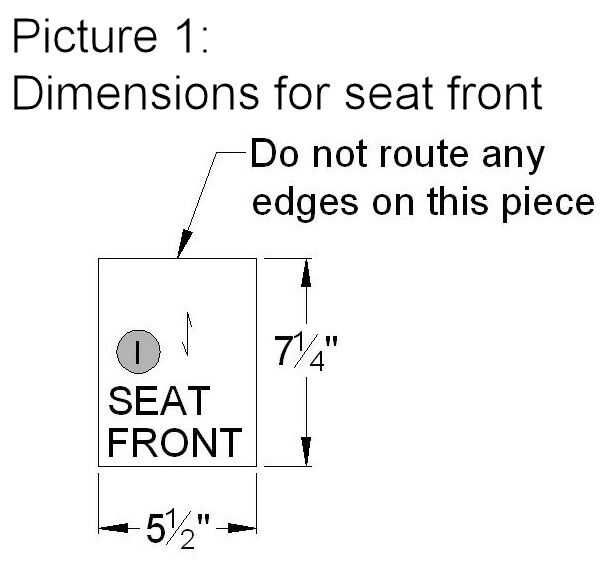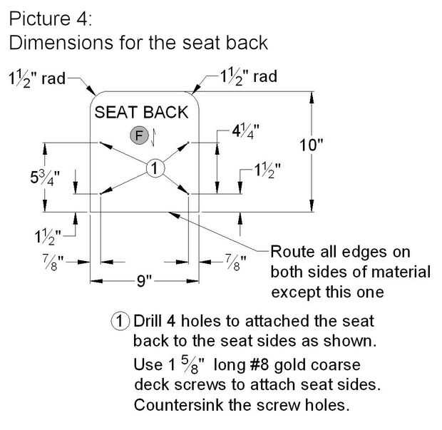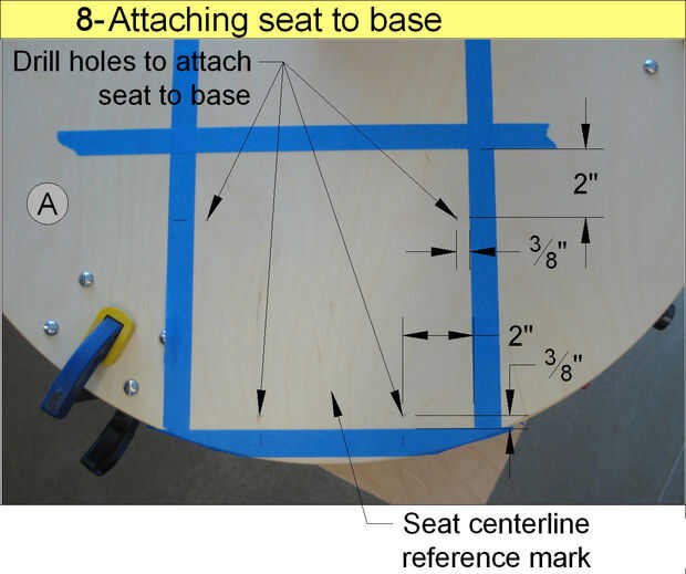 Con pintores cinta marque los lados del asiento con la marca de referencia central para el asiento de la grúa. A continuación coloque el asiento montado entre las marcas de cinta y posición para que el respaldo del asiento no cuelgue sobre el borde routered del círculo base. Coloque una línea de cinta en frente y detrás del asiento para marcar el contorno completo del asiento. Marque y perfore los agujeros que unirá el asiento al círculo de la base como se muestra en el cuadro #8 más abajo. Los agujeros tendrán que ser perforado 3/8" en de la cinta de pintores con el fin de estar en el centro de los lados del asiento y respaldo.