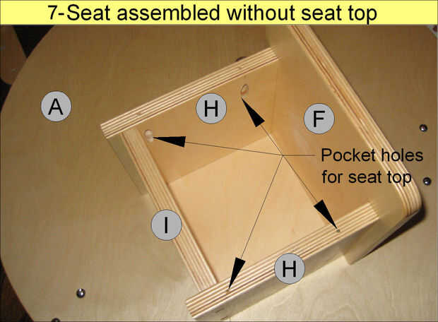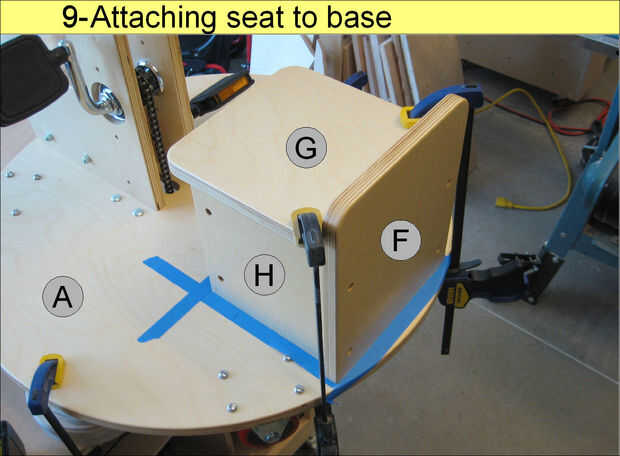 Ajustar el asiento en el círculo de base mediante la alineación de la cinta como se muestra en el cuadro #9. Taladrar y avellanar los agujeros para 2" larga #8 oro gruesos tornillos fijar el asiento a la base.