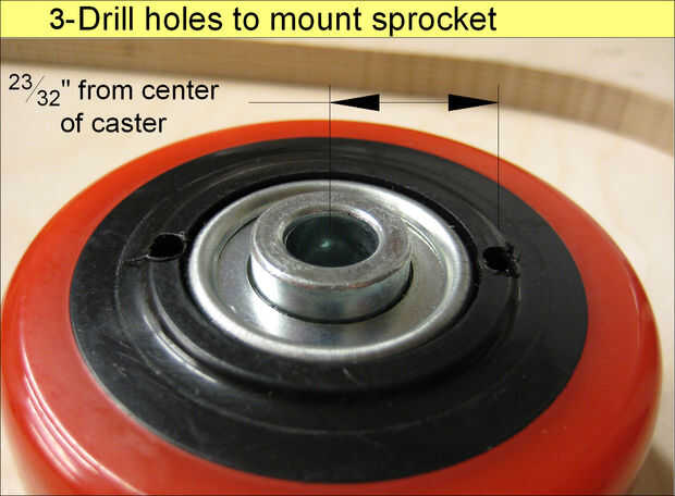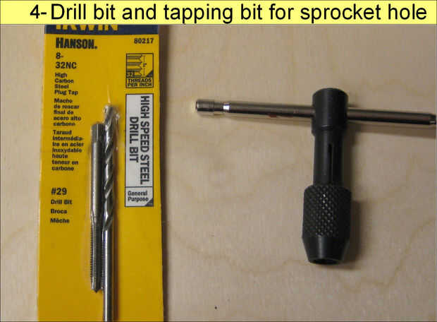 Usando un taladro roscado para un #8 x 32 hilo de rosca por pulgada tornillo broca que empareja los agujeros en el piñón de 18 dientes #35. Empezar los agujeros en el lado del cubo de la rueda dentada.