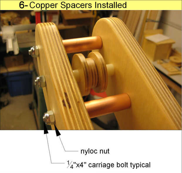 Se instala el tubo de cobre con espaciadores de nylon interior de la tubería para limitar el movimiento en cualquier dirección. Sin los espaciadores de nylon el movimiento de los espaciadores cobre rayará el interior caras del boom. Los pernos de carruaje a través del tubo de cobre se instalan con una tuerca de nylon en el extremo. Ver cuadro #6 abajo.