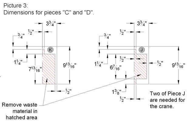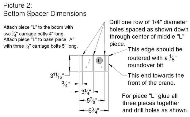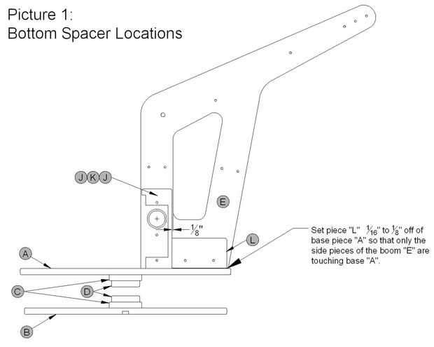 Pegar las piezas de tres "L" y colocar entre ambas piezas de boom como se muestra en la imagen siguiente. Marque los dos los agujeros en la pieza "L" donde los 1/4 pernos de carruaje atravesará la pieza de un lado de la pluma al otro. Taladre los orificios de diámetro de 1/4" a través de"L".